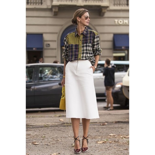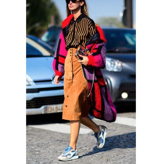 Φόρεσε μια midi φούστα σε γραμμή Α και συνδύασέ την με ένα πουκάμισο φορεμένο από μέσα, sneakers και ένα εμπριμέ oversized παλτό.