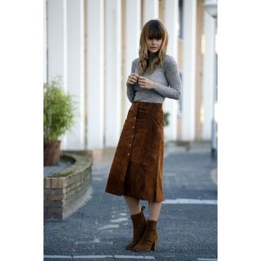Διάλεξε μια suede φούστα σε γραμμή Α και συνδύασέ την με μια μπλούζα με ζιβάγκο και ankle boots με τετράγωνο τακούνι.