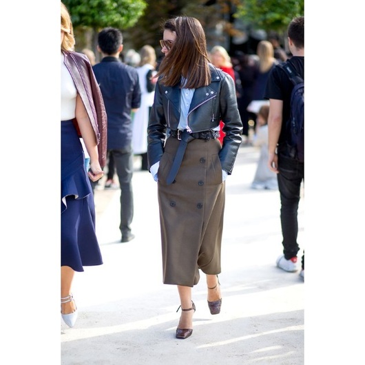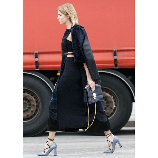 Φόρεσε μια ψηλόμεση midi φούστα με μήκος μέχρι τη μέση της γάμπας σε συνδυασμό με ένα crop top και ολοκλήρωσε το look με ένα παλτό περίπου στο ίδιο μήκος με τη φούστα και lace-up ψηλοτάκουνες γόβες.