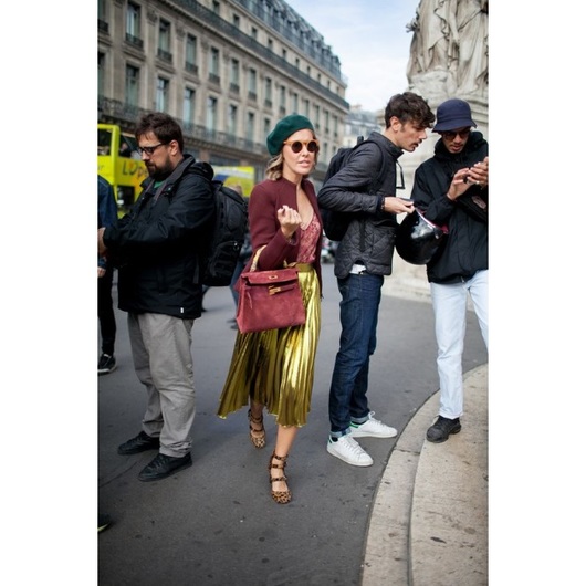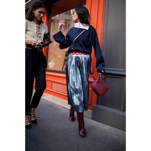 Φόρεσε μια πλισέ midi φούστα σε μεταλλική απόχρωση και ταίριάξε την με στρογγυλές μπότες με τετράγωνο τακούνι κι ένα τοπ φορεμένο από μέσα.