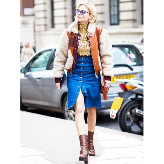 Φόρεσε μια denim φούστα σε γραμμή Α με κουμπιά με ένα τοπ με ζιβάγκο, ankle boots και ένα jacket με sheepskin επένδυση.