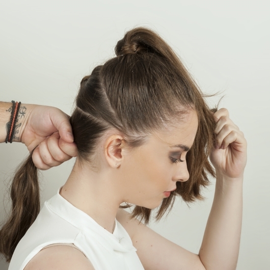 Χτένισε και τράβηξε τα μαλλιά σου προς τα πίσω και ψηλά στην κορυφή ώστε να τα πιάσεις. Φρόντισε η επιφάνειά τους να είναι sleek.